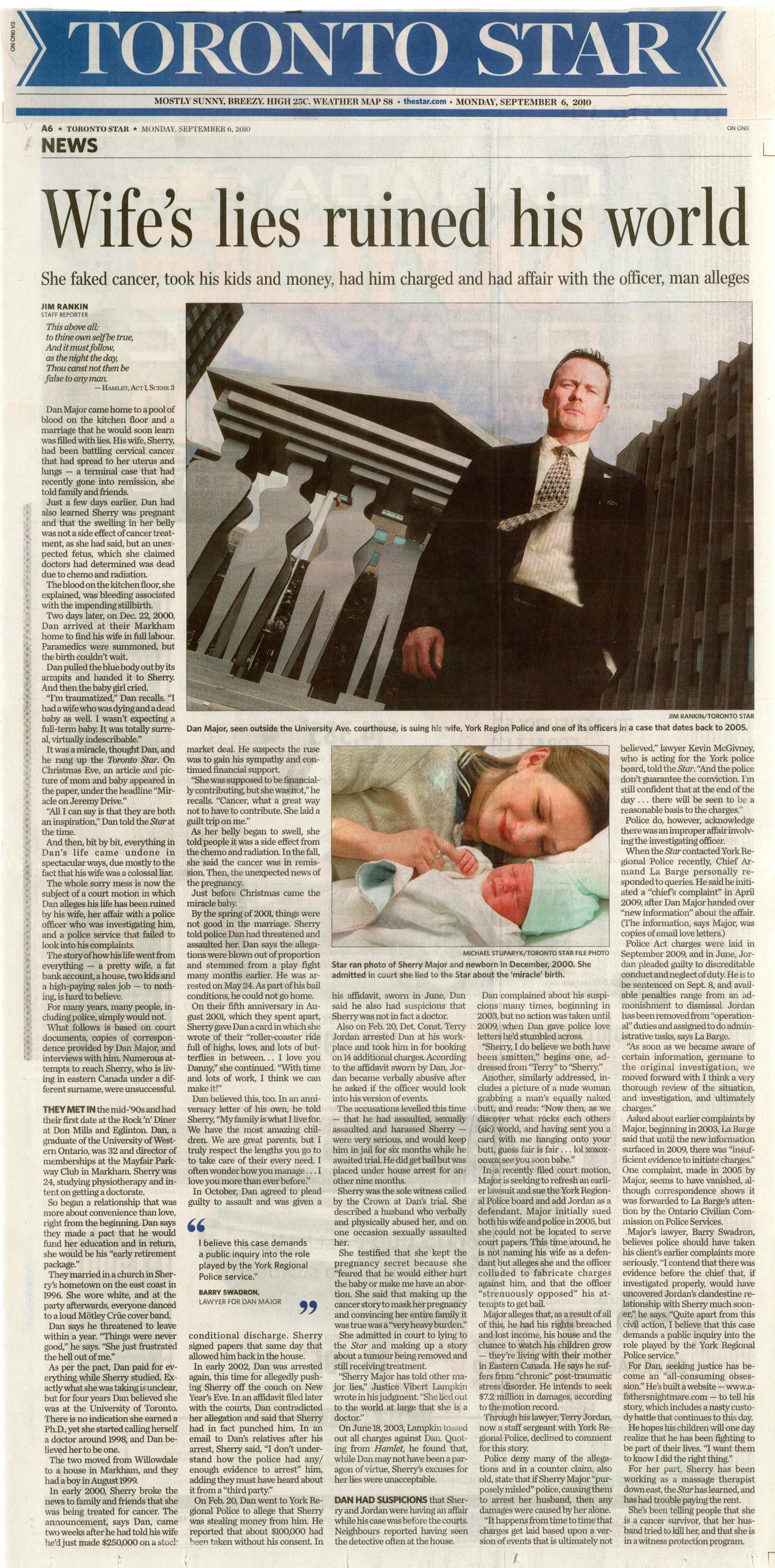 SHERRY MAJOR'S LIES RUINED. DAN MAJOR'S WORLD (Toronto Star Article SEPTEMBER 6,2010)